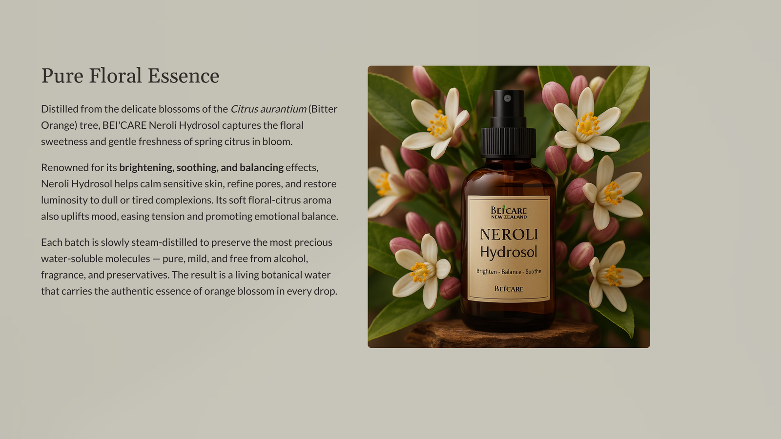 Each batch is slowly steam-distilled to preserve the most precious water-soluble molecules — pure, mild, and free from alcohol, fragrance, and preservatives.