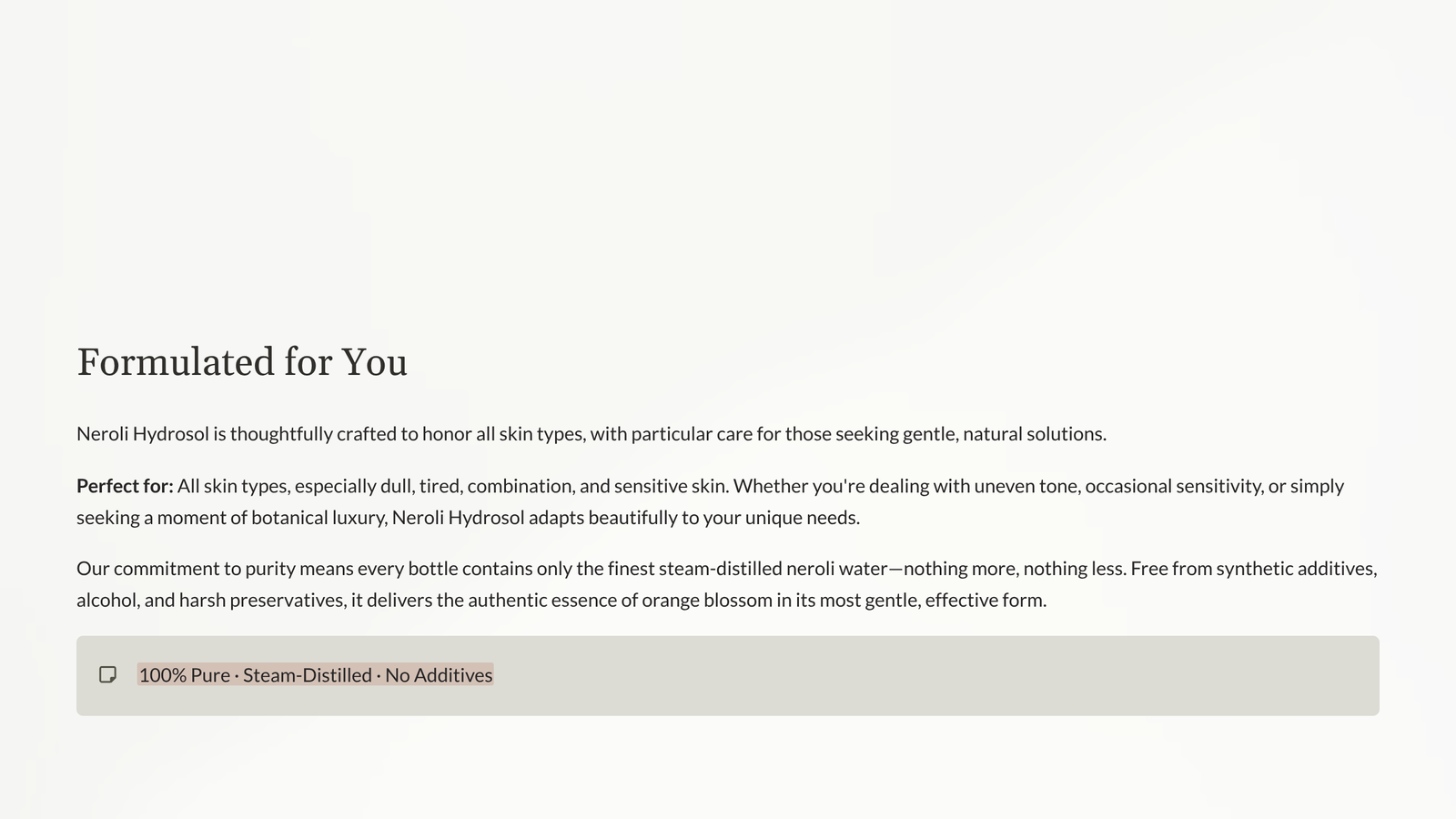 Renowned for its brightening, soothing, and balancing effects, Neroli Hydrosol helps calm sensitive skin, refine pores, and restore luminosity to dull or tired complexions.