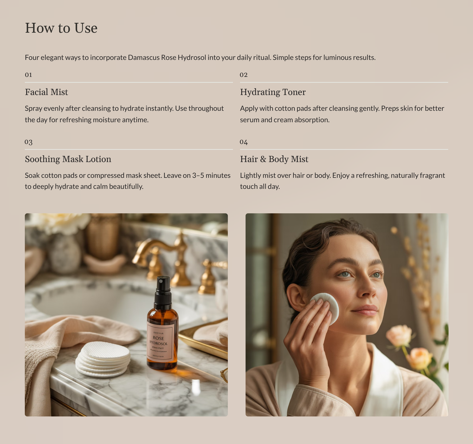A gentle floral water distilled from fresh Rosa Damascena petals.