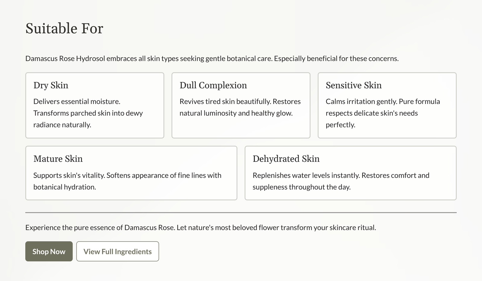 Rich in natural antioxidants and hydrating compounds, Rose Hydrosol helps soothe, soften, and brighten the skin while promoting a healthy, radiant glow.